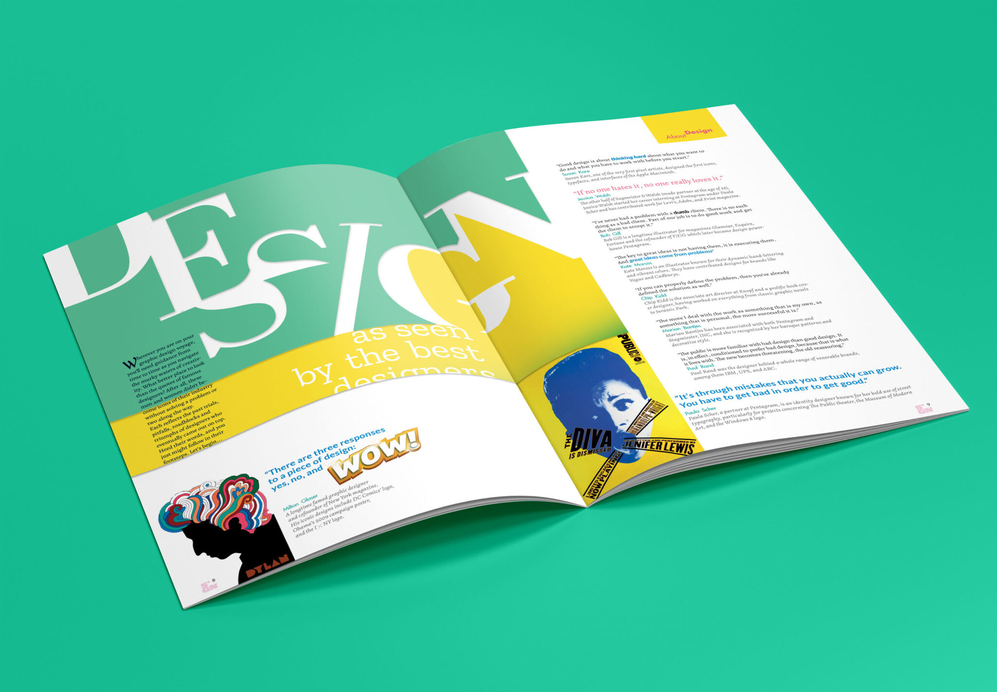 Este spread es el inicio de una nota sobre frases y consejos de grandes diseñadores. Integré piezas icónicas en la estructura de la nota, y le di protagonismo a las famosas palabras de Milton Glaser.