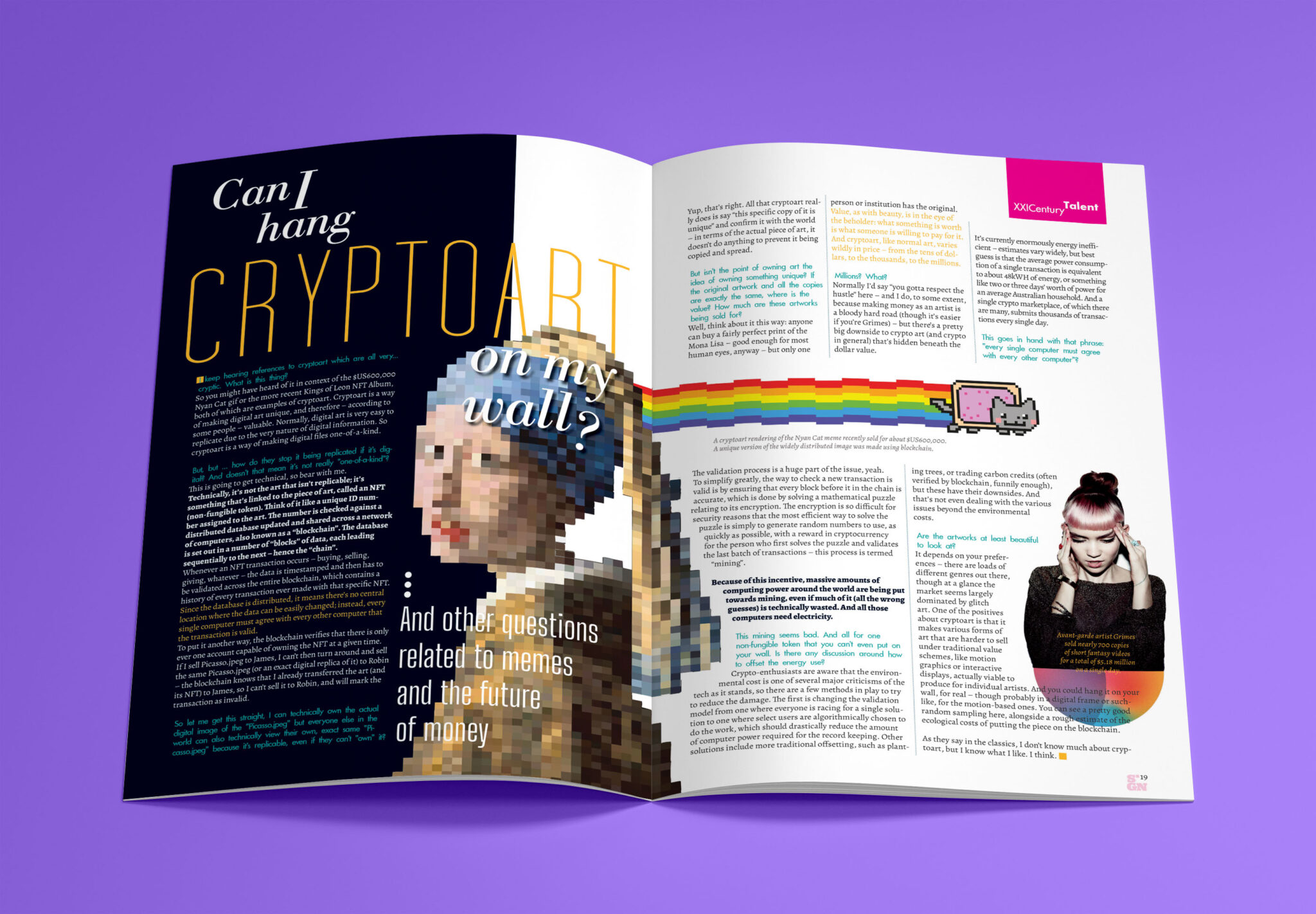 El próximo spread se trata del criptoarte y otras expresiones digitales emergentes. Para ilustrar el punto, utilicé el pixel art, rompiendo la brecha entre el medio físico y los soportes digitales. El trabajo tipográfico le aporta variedad y facilita la lectura en una grilla atípica.