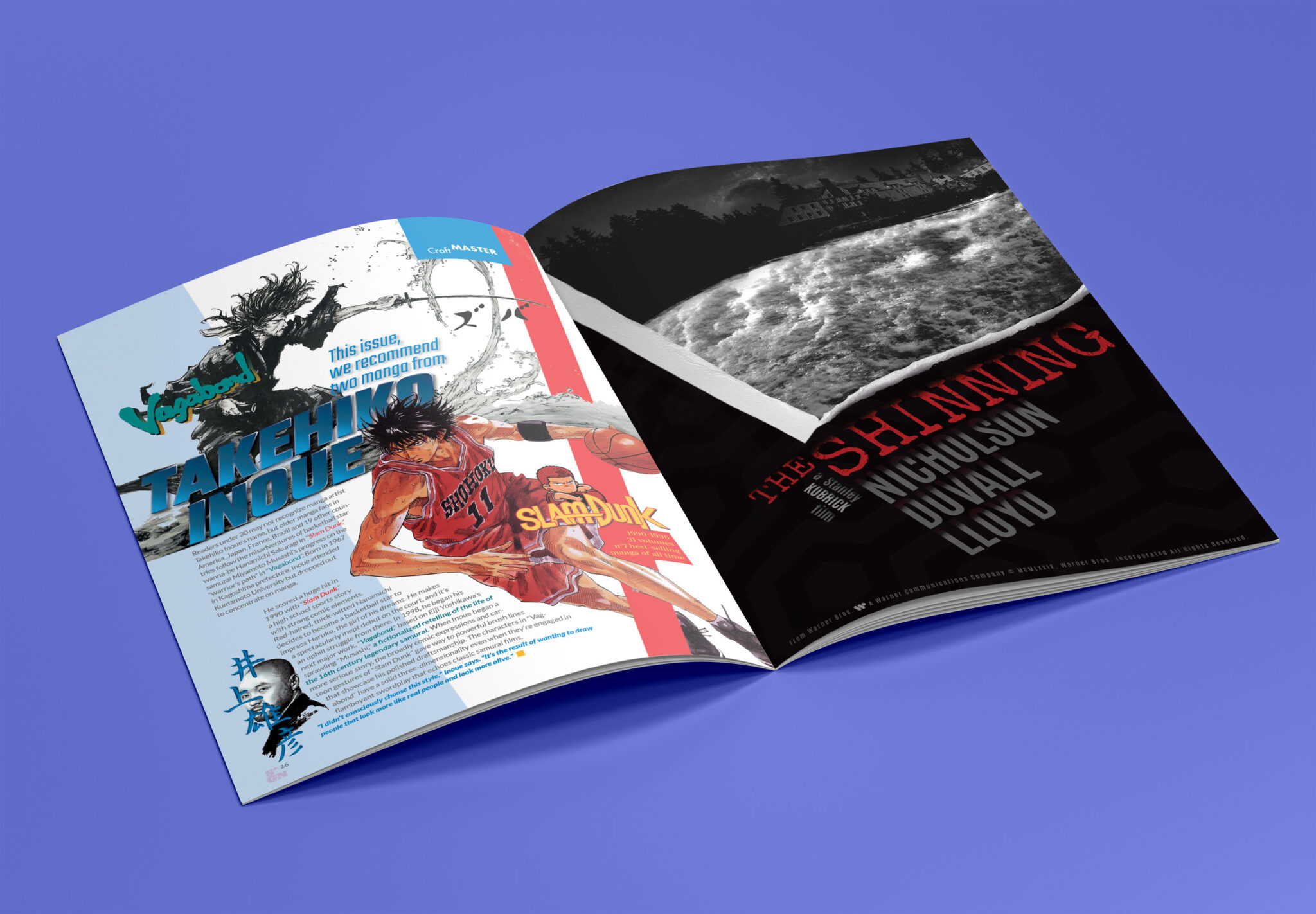 Para finalizar este recorrido, comparto esta página súper dinámica, destacando la obra de una de los mangakas más famosos. Es un diseño que rompe la lógica de «revista» y se acerca más al poster -con diagonales y horizontales que dejan el texto en segundo plano -pero no por ello menos legible. La publicidad es de mi autoría y quise aprovechar para seguir mostrando una de mis herramientas favoritas: la profundidad en medios planos.